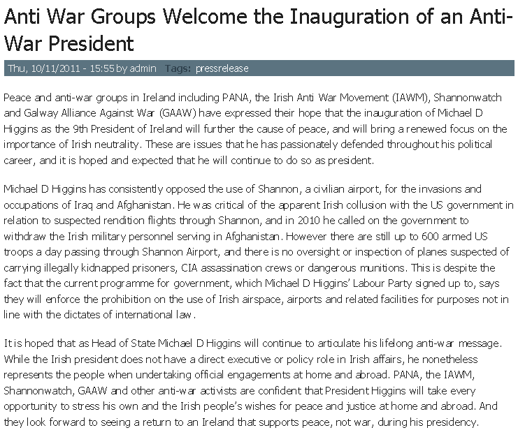 Anti-American groups welcome Higgins as President, 10 Nov 2011.