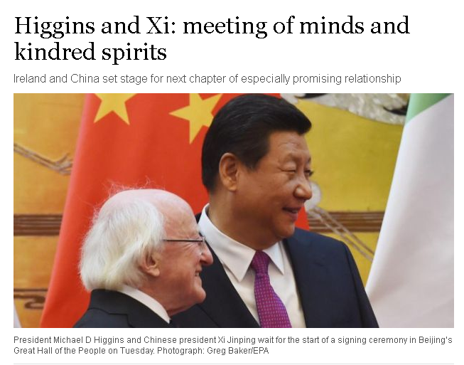 Chinese state propaganda, 21 Feb 2012 (click to play) uses Michael D. Higgins as he amorally welcomes the Chinese Vice-President. "Higgins, for his part, said Xi's visit is of vital significance, noting that Ireland appreciates China's achievements and values its friendship."