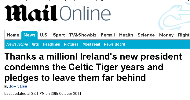 Michael D.'s inaugural speech, 11 Nov 2011, shows his contempt for the Celtic Tiger and Irish prosperity: