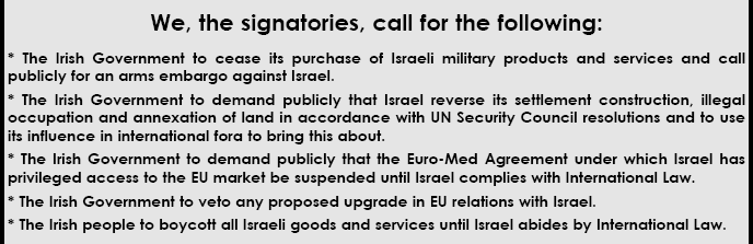 "The undersigned also urge all citizens of Ireland to support a boycott of all Israeli goods and services".