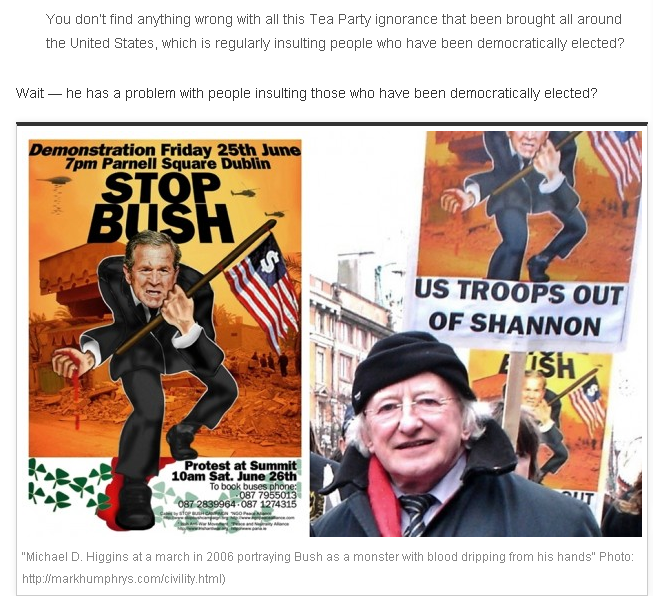 "the reprehensible protests which were specifically designed to ridicule the valiant men and women of our American military who were passing through Shannon Airport. He has the unmitigated nerve to call somebody else "a wanker"".
