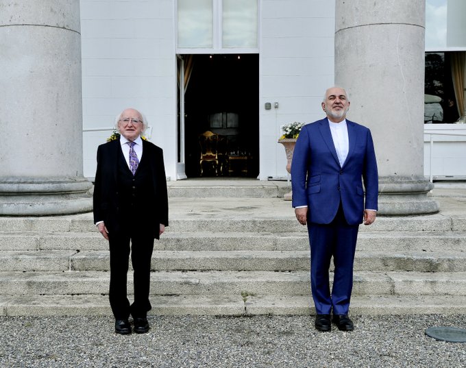 "President Higgins bidding farewell to the Minister for Foreign Affairs of the Islamic Republic of Iran, Mohammad Javad Zarif, at Áras an Uachtaráin today."