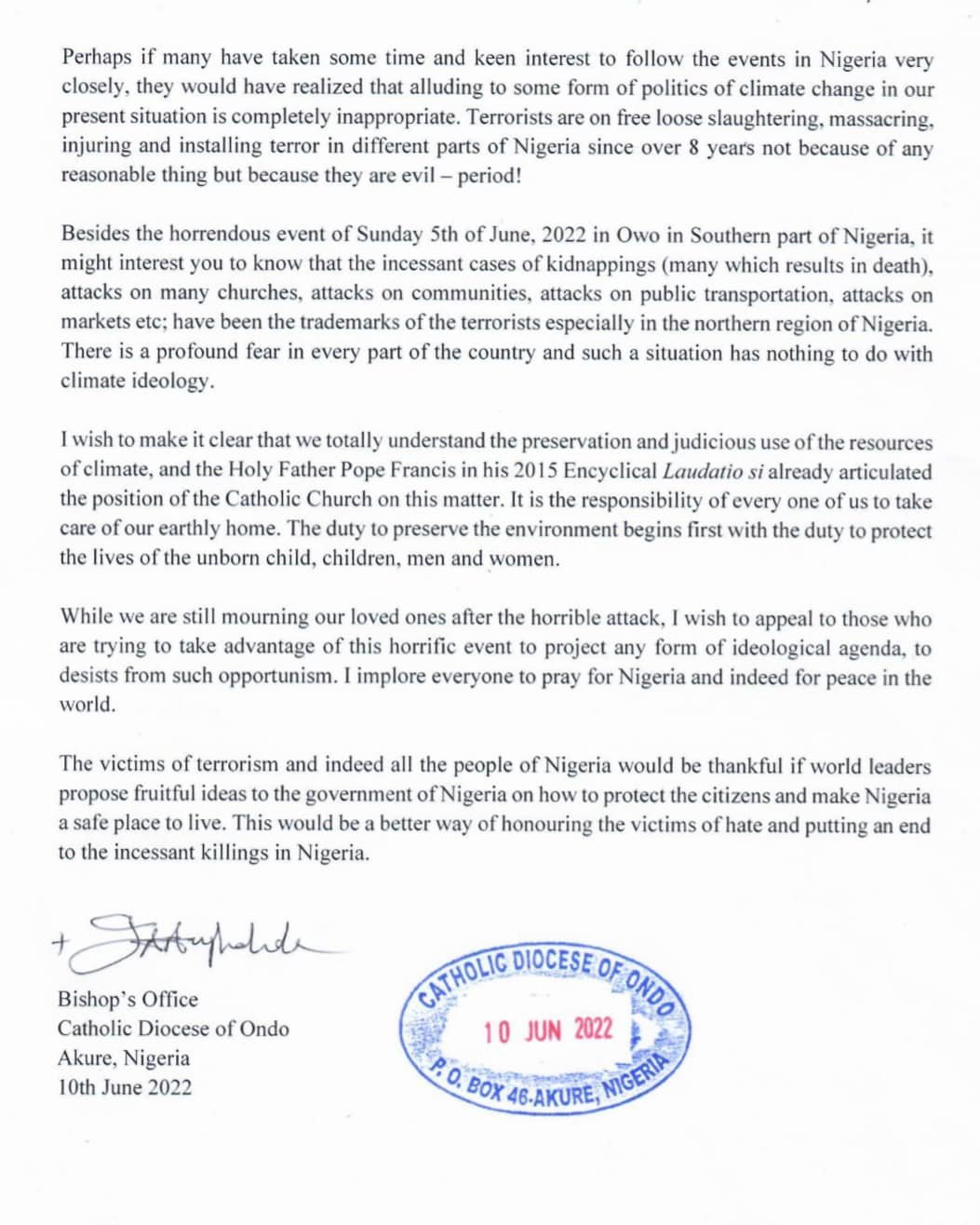 Owo church massacre in Nigeria, in which 40 Christians were murdered at Mass by Muslims.