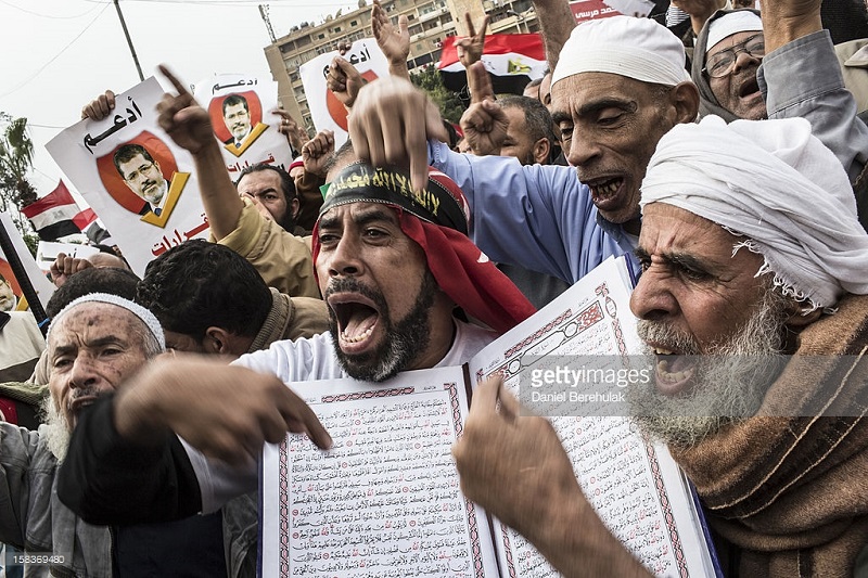 Supporters of the Muslim Brotherhood and Morsi hold up a Koran and chant slogans during a rally in Egypt