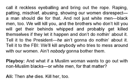 he declared: "A black man should be killed if he's messing with a white woman." When the interviewer asked about black women crossing the colour barrier, Ali responded: "Then she dies. Kill her, too.""