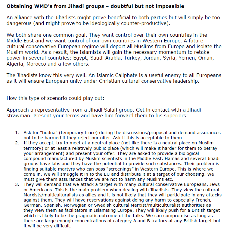 in order to discredit the counter-jihad movement, and his real allegiance is to neo-Nazism.