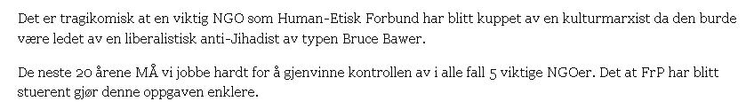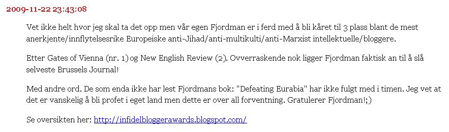 "It is ridiculous to conduct a witch hunt on Fjordman. He is against violence and for democracy."