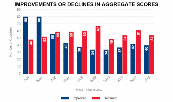 shows countries improving and declining in their freedom ratings each year.