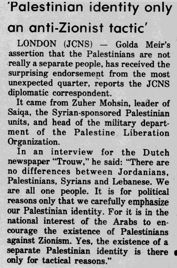 "The Palestinian people does not exist. ... In reality today there is no difference between Jordanians, Palestinians, Syrians and Lebanese. Only for political and tactical reasons do we speak today about the existence of a Palestinian people, since Arab national interests demand that we posit the existence of a distinct "Palestinian people" to oppose Zionism.