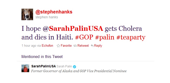 spews hatred against Sarah Palin's disabled child, Oct 2008.