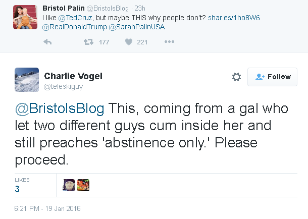 Charlie Vogel, 19 Jan 2016, tells Bristol Palin that too many men have "cum inside her" for his liking.