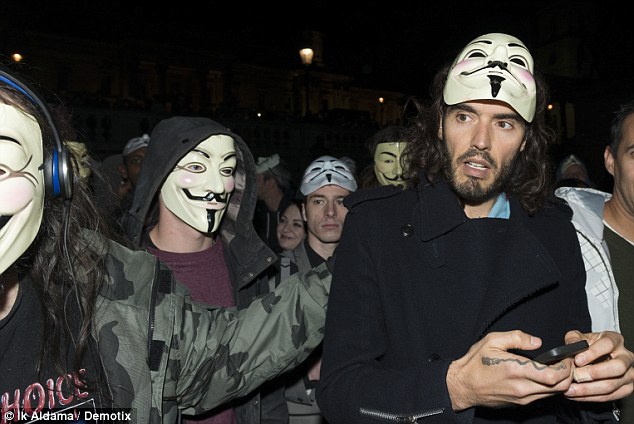 Russell Brand leads a mob rioting against government budget cuts, London, Nov 2013.