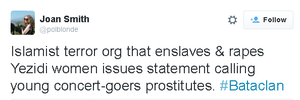 "The targets included the Bataclan Theater for Exhibitions where hundreds of pagans gathered for a concert of prostitution and vice."