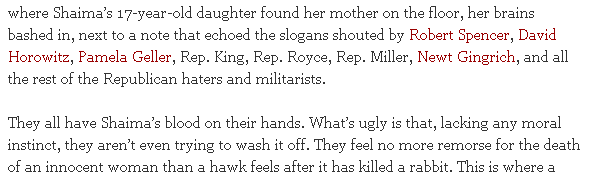 Charles Johnson, 25 Mar 2012, goes straight to blaming Robert Spencer for the killing.