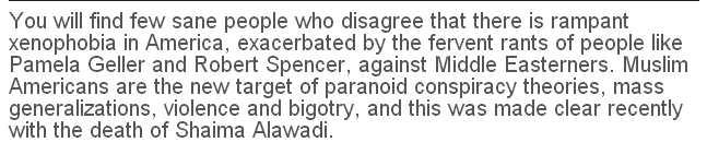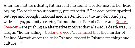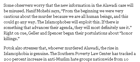 "Police, however, weren't as gullible as the media. Instead of jumping to conclusions about bigotry and racism, they examined the evidence and realized that Alawadi was murdered by her husband, not by an Islamophobe."