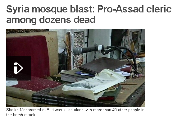 The pro-jihad, pro-sharia, pro-Assad cleric Mohammed al-Bouti is killed by a Syrian rebel suicide bomber in Mar 2013.