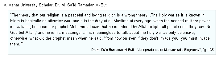 "Its goal is the exaltation of the Word of God and the construction of Islamic society and the establishment of God's Kingdom on Earth regardless of the means. The means would be offensive warfare. In this case it is the apex, the most noble Holy War. It is legal to carry on a Holy War."