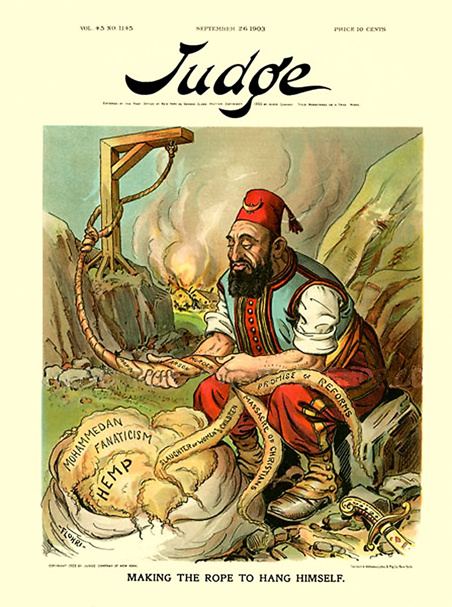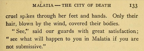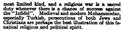 On the other side of the way were the skeletons of two children lying side by side .. with frightful, sabre cuts in their little skulls. The number of children killed in these massacres is something enormous. They were often spitted on bayonets, and we have several stories from eye-witnesses who saw the little babes carried about the streets .. on the points of bayonets. The reason is simple. When a Mohammedan has killed a certain number of infidels he is sure of Paradise, no matter what his sins may be."