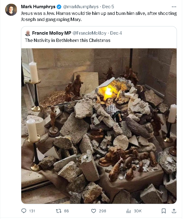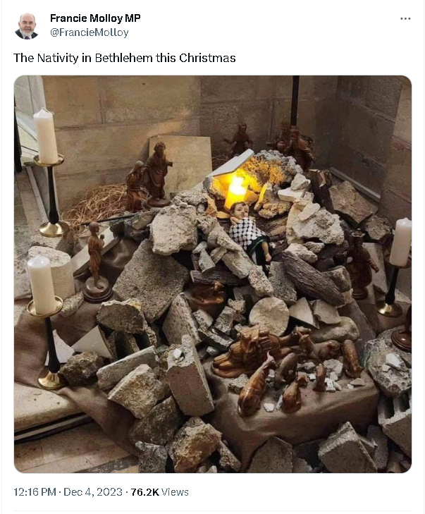 implies that Jesus, a Jew, would be at risk from the Israeli bombing of Hamas.
