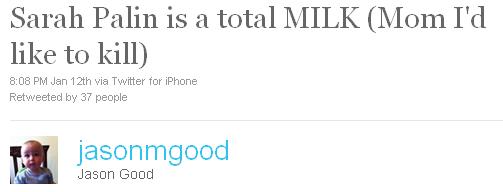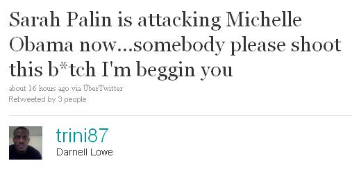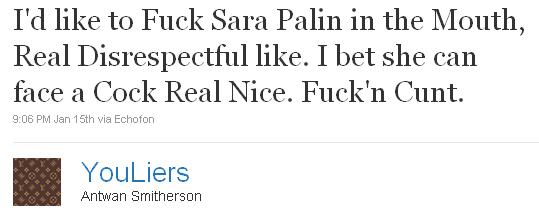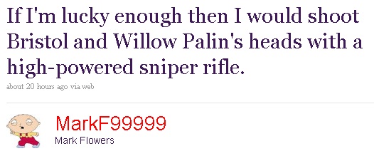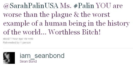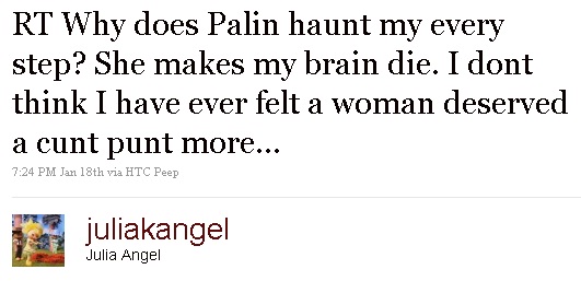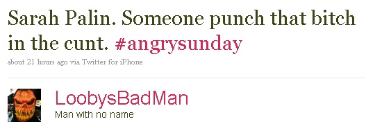 This did not stop the hatred and fury, which is well captured on Twitter. People below felt free to express in public that they wanted Palin dead, raped, or both. One even wants her children dead.
