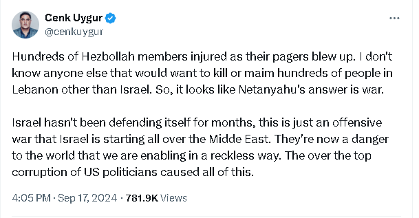 "Cenk Uygur basically ... just hates Israel because he's Turkish."