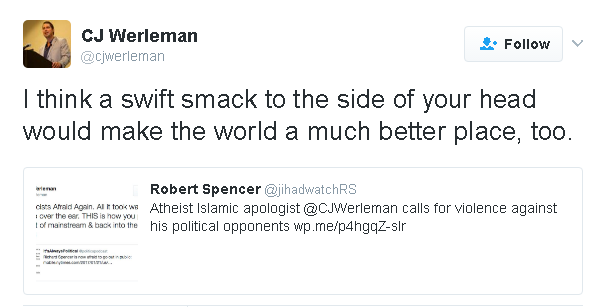 CJ Werleman, 22 Jan 2017, calls for violence against counter-jihadist Robert Spencer.