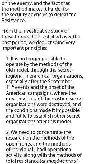 "It is no longer possible to operate by the methods of the old model, through the 'secret regional-hierarchical' organisations, especially after the September 11 events and the onset of the American campaigns, where the great majority of the existing secret organisations were destroyed."