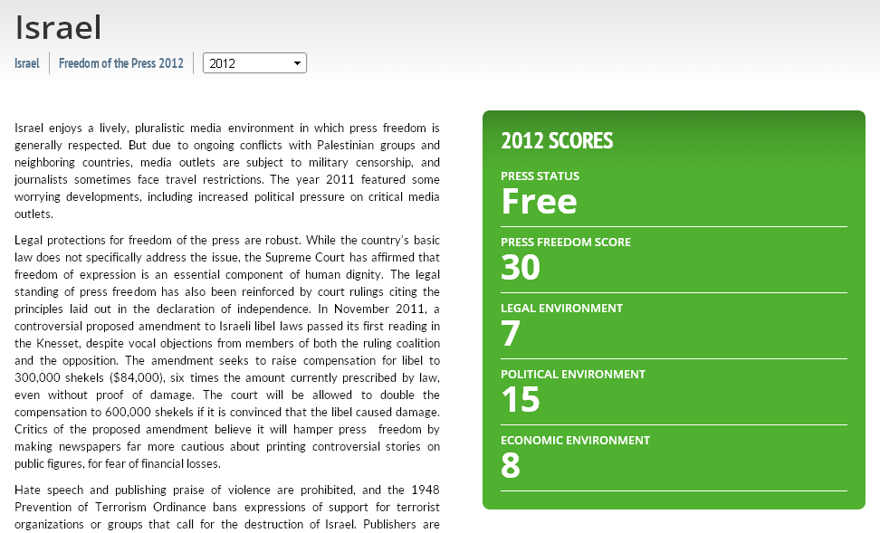 And note that Freedom House are not blindly pro-Israel. They ticked Israel over from 30, the bottom of "Free" in 2012, to 31, the top of "Partly Free" (the middle category) in 2013. Still a long way from the RSF view of the world, though.