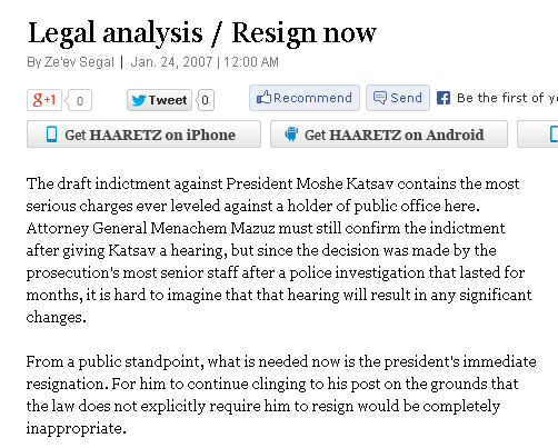 calls on the President of Israel to resign, 24 Jan 2007.