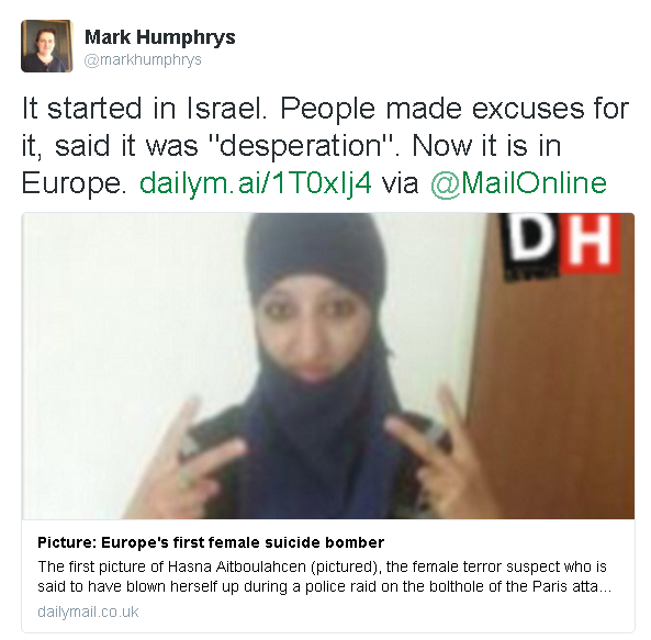 sums up the idiot view that Palestinian suicide bombers are "desperate".