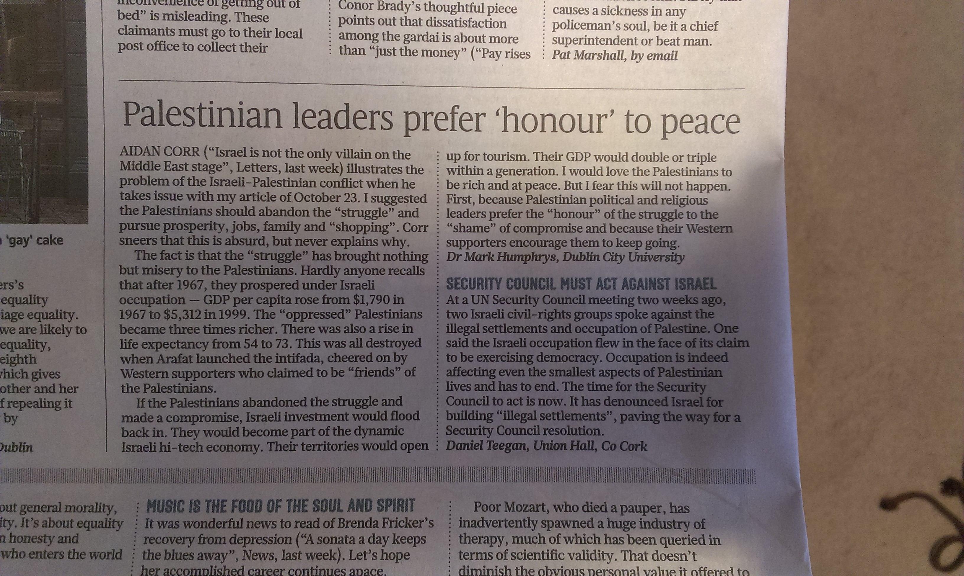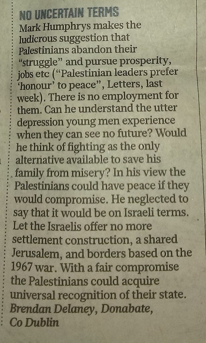 Aidan Corr (Letters, 30 Oct), though he may not mean to, actually illustrates the central problem of the Israeli-Palestinian conflict when he takes issue with my article of 23 Oct. I suggested that the Palestinians should abandon the "struggle" and pursue prosperity, jobs, family and "shopping". Corr sneers at this as obviously absurd. But he never explains why it is absurd.