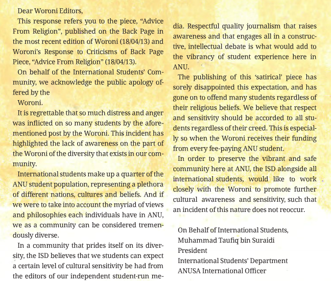 "over the course of a week, the Woroni board was twice summoned to the Chancelry, individually threatened with disciplinary action along with the authors of the piece, and informed that Woroni's funding allocation could be compromised.